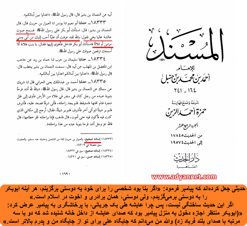 حدیثی جعل کردهاند که پیامبر فرمود: «اگر بنا بود شخصی را برای خود به دوستی برگزینم، هر آینه ابوبکر را به دوستی برمیگزیدم، ولی دوستی، همان برادری و اخوت در اسلام است.» اگر این حدیث ساختگی نیست، پس چرا عایشه طی یک جریانی، با پرخاشگری به پیامبر عرض کرد: «(ابوبکر منتظر اجازه گرفتن به داخل منزل پیامبر بود که صدای عایشه از داخل خانه شنیده شد که دو یا سه مرتبه با صدای بلند فریاد زد) والله من میدانم که جایگاه علی برای تو از جایگاه من و پدرم بالاتر است...»