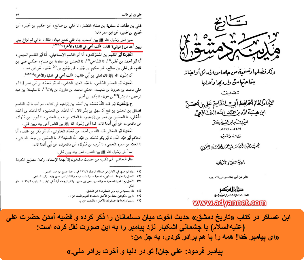 ابن عساکر در کتاب «تاریخ دمشق» حدیث اخوت میان مسلمانان را ذکر کرده و قضیه آمدن حضرت علی (علیهالسلام) با چشمانی اشکبار نزد پیامبر را به این صورت نقل کرده است: «ای پیامبر خدا! همه را با هم برادر کردی، به جز من؛ پیامبر فرمود: علی جان! تو در دنیا و آخرت برادر منی.»