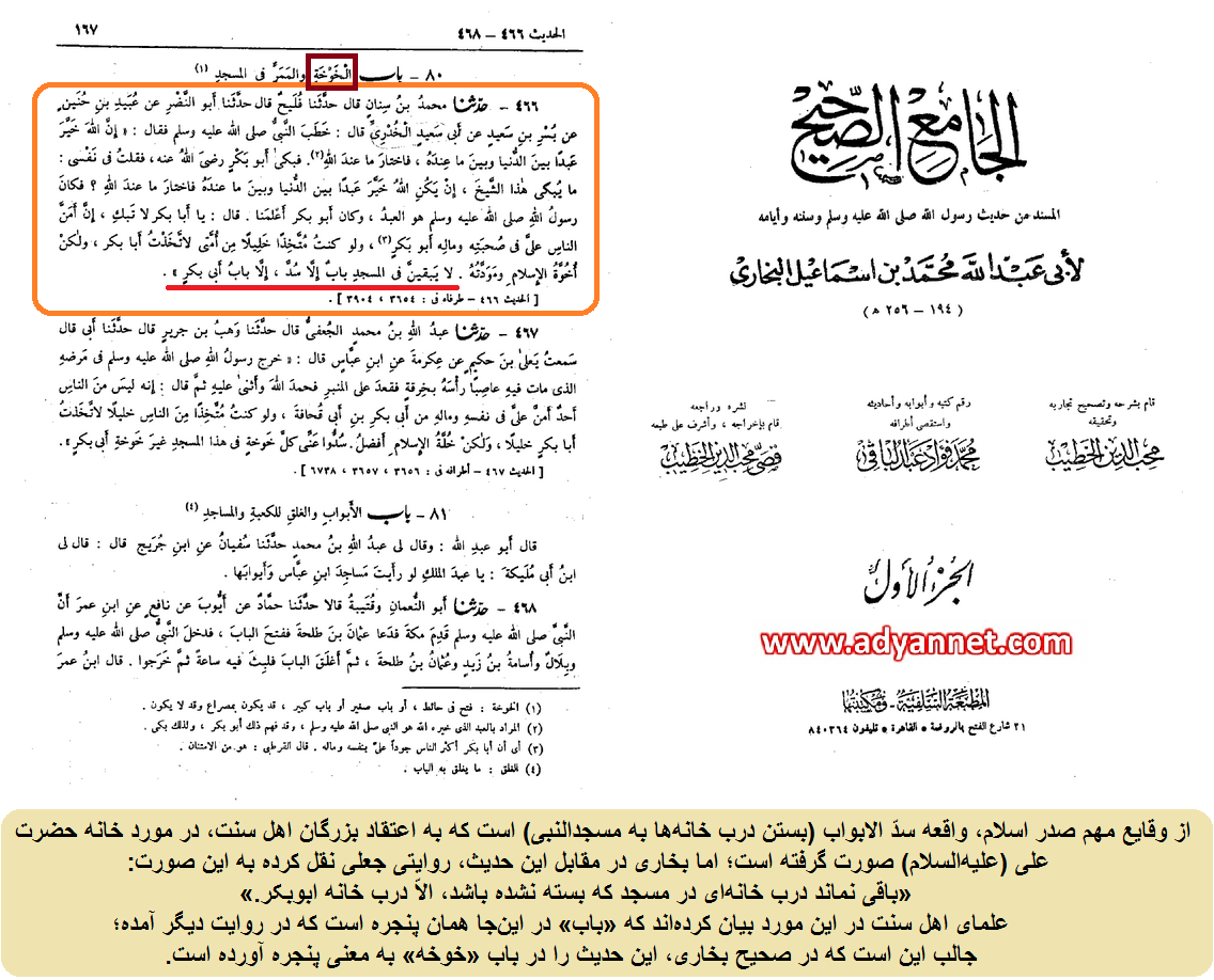 از وقایع مهم صدر اسلام، واقعه سدّ الابواب (بستن درب خانهها به مسجدالنبی) است که به اعتقاد بزرگان اهل سنت، در مورد خانه حضرت علی (علیهالسلام) صورت گرفته است؛ اما بخاری در مقابل این حدیث، روایتی جعلی نقل کرده به این صورت: «باقی نماند درب خانهای در مسجد که بسته نشده باشد، الاّ درب خانه ابوبکر.»