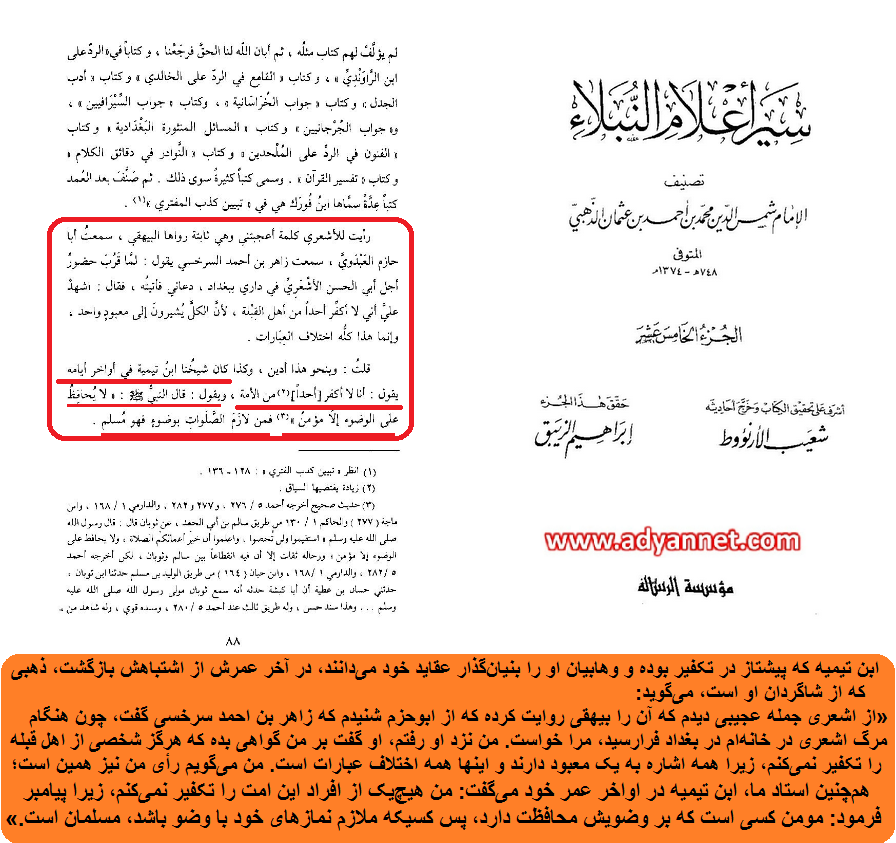 ابن تیمیه که پیشتاز در تکفیر بوده و وهابیان او را بنیان‌گذار عقاید خود می‌دانند، او در آخر عمرش از اشتباهش بازگشت، ذهبی که از شاگردان او است، می‌گوید: «از اشعری جمله عجیبی دیدم که ثابت است و آن را بیهقی روایت کرده که از ابوحزم عبدری شنیدم که گفت از زاهر بن احمد سرخسی شنیدم که گفت چون هنگام مرگ اشعری در خانه‌ام در بغداد فرارسید، مرا خواست. من نزد او رفتم، او گفت بر من گواهی بده که هرگز شخصی از اهل قبله را تکفیر نمی‌کنم، زیرا همه اشاره به یک معبود دارند و این‎ها همه اختلاف عبارات است. من می‌گویم رأی من نیز همین است؛ هم‌چنین استاد ما، ابن تیمیه در اواخر عمر خود می‌گفت: من هیچ‌یک از افراد این امت را تکفیر نمی‌کنم، زیرا پیامبر فرمود: مومن کسی است که بر وضوی خود محافظت دارد، پس هر کس که ملازم نمازهای خود با وضو باشد، مسلمان است...»