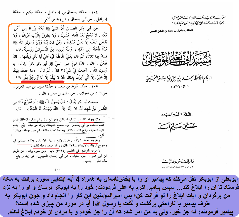 ابویعلی از ابوبکر نقل میکند که پیامبر او را با بخشنامهای به همراه 4 آیه ابتدایی سوره برائت به مکه فرستاد تا آن را ابلاغ کند... سپس پیامبر اکرم به علی فرمودند: خود را به ابوبکر برسان و او را به نزد من برگردان و آیات ابلاغ را تو قرائت کن؛ پس امیرالمؤمنین این کار را انجام داد و چون ابوبکر به طرف پیامبر با ناراحتی برگشت و گفت یا رسول الله! آیا در مورد من چیزی شده است؟ پیامبر فرمودند: نه جز خیر، ولی به من امر شده که آن را جز خودم و یا مردی از خودم ابلاغ نکند.