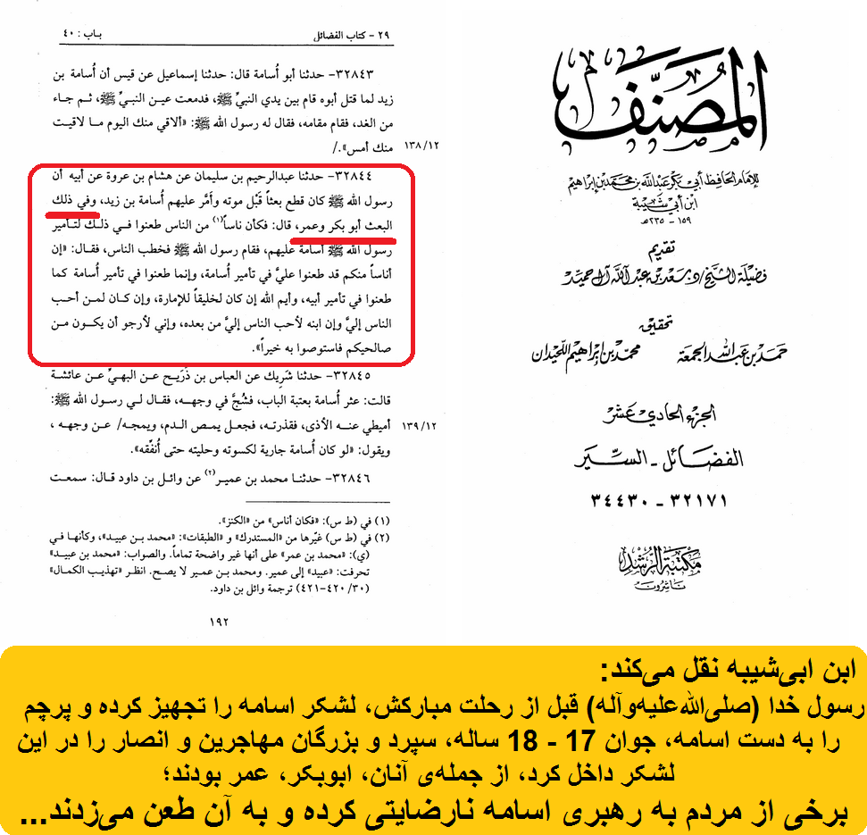 ابن ابیشیبه نقل میکند: رسول خدا (صلیاللهعلیهوآله) قبل از رحلت مبارکش، لشکر اسامه را تجهیز کرده و پرچم را به دست اسامه، (جوان 17 - 18 ساله)، سپرد و بزرگان مهاجرین و انصار را در این لشکر داخل کرد، از جملهی آنان، ابوبکر، عمر بودند؛ برخی از مردم به رهبری اسامه نارضایتی کرده و به آن طعن میزدند.