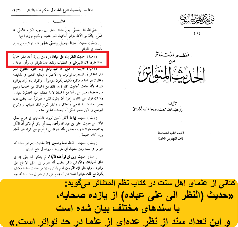 کتانی از علمای اهل سنت در کتاب نظم المتناثر میگوید: «حدیث (النظر الی علی عباده) از یازده صحابه، با سندهای مختلف بیان شده است و این تعداد سند از نظر عدهای از علما در حد تواتر است.»