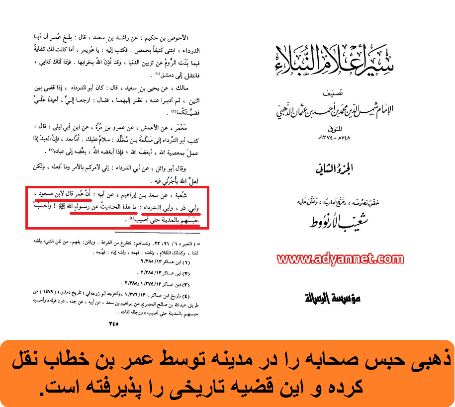 ذهبی حبس صحابه را در مدینه توسط عمر بن خطاب نقل کرده و این قضیه تاریخی را پذیرفته است.