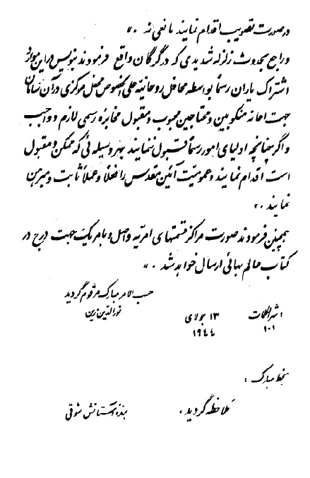 [3]. شوقی افندی، توقیعات مبارکه، بیجا: مؤسسهی ملّی مطبوعات امری، 1922-1948، ج 3، ص 264.