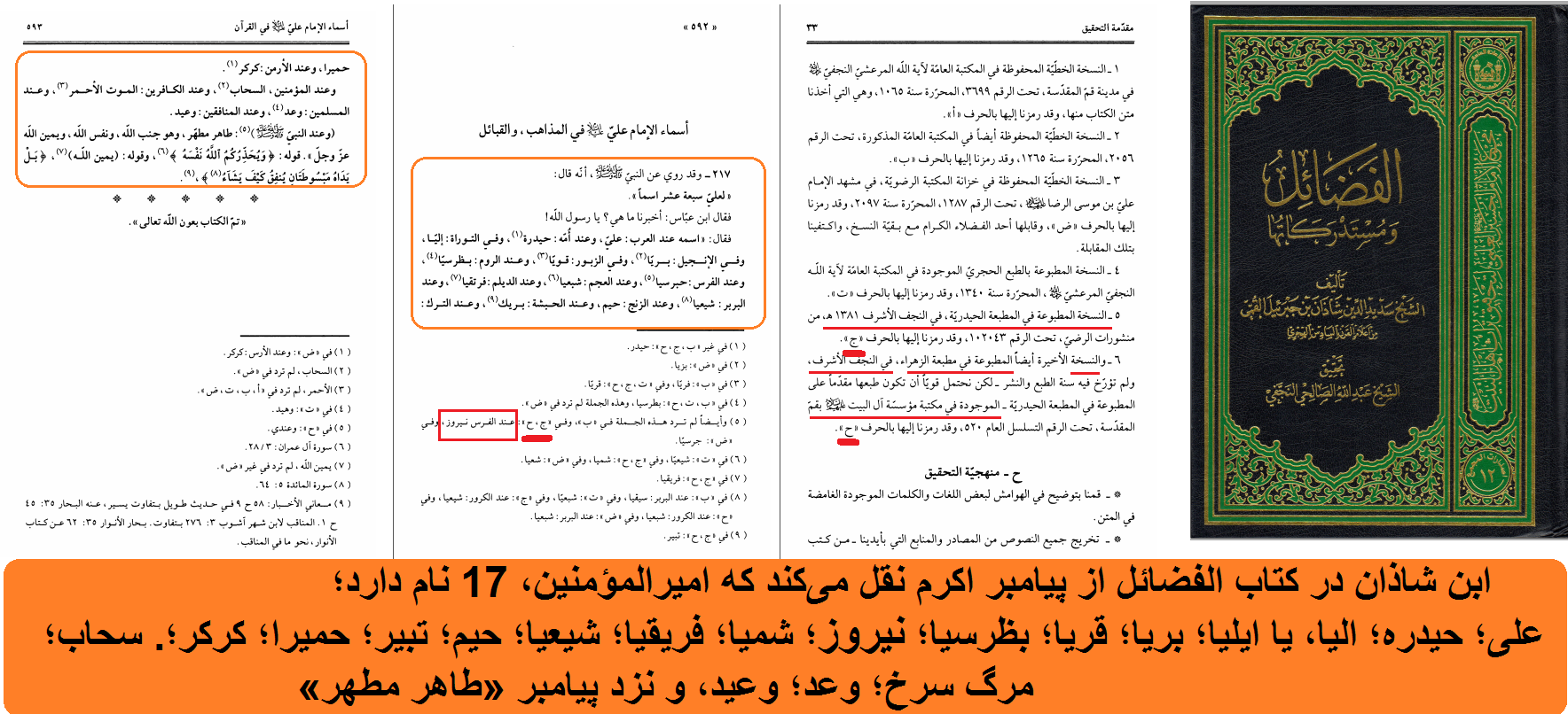 ابن شاذان در کتاب الفضائل از پیامبر اکرم نقل میکند که امیرالمؤمنین، 17 نام دارد؛ علی؛ حیدره؛ الیا، یا ایلیا؛ بریا؛ قریا؛ بظرسیا؛ نیروز؛ شمیا؛ فریقیا؛ شیعیا؛ حیم؛ تبیر؛ حمیرا؛ کرکر؛ سحاب؛ مرگ سرخ؛ وعد؛ وعید، و نزد پیامبر «طاهر مطهر»
