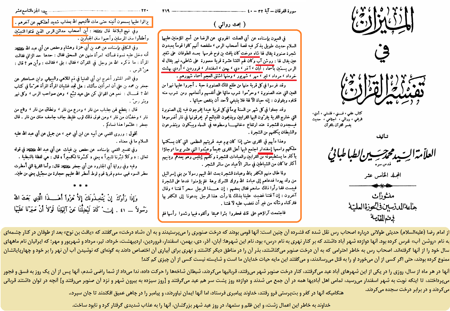 علامه طباطبایی از امام رضا (علیه‌السلام) حدیثی طولانی درباره اصحاب رس را به این صورت به طور فشرده نقل می‌کند: آنها قومی بودند که درخت صنوبری را می‌پرستیدند و به آن «شاه درخت» می‌گفتند که «یافث بن نوح» بعد از طوفان در کنار چشمه‌ای به نام «روشن آب» غرس کرده بود. آنها دوازده شهر آباد داشتند که بر کنار نهری به نام «رس» بود، نام این شهرها: آبان، آذر، دی، بهمن، اسفندار، فروردین، اردیبهشت، خرداد، تیر، مرداد و شهریور و مهر؛ که ایرانیان نام ماههای سال خود را از آنها گرفته‌اند. اصحاب رس به خاطر احترامی که به آن درخت صنوبر می‌گذاشتند، بذر آن را در مناطق دیگر کاشتند و نهری برای آبیاری آن اختصاص دادند به گونه‌ای که نوشیدن آب آن نهر را بر خود و چهارپایانشان ممنوع کرده بودند، حتی اگر کسی از آن می‌خورد او را به قتل می‌رساندند، و می‌گفتند این مایه حیات خدایان ما است و شایسته نیست کسی از آن چیزی کم کند!