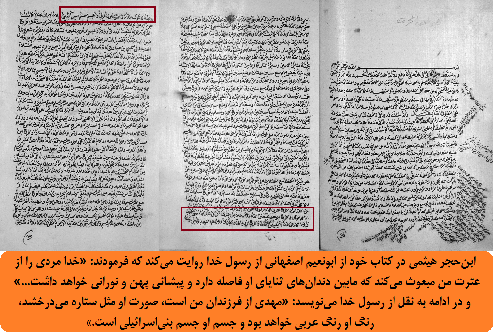 ابنحجر هیثمی در کتاب خود از ابونعیم اصفهانی از رسول خدا روایت میکند که فرمودند: «خدا مردی را از عترت من مبعوث میکند که مابین دندانهای ثنایای او فاصله دارد و پیشانی پهن و نورانی خواهد داشت...» و در ادامه به نقل از رسول خدا مینویسد: «مهدی از فرزندان من است، صورت او مثل ستاره میدرخشد، رنگ او رنگ عربی خواهد بود و جسم او جسم بنیاسرائیلی است.»