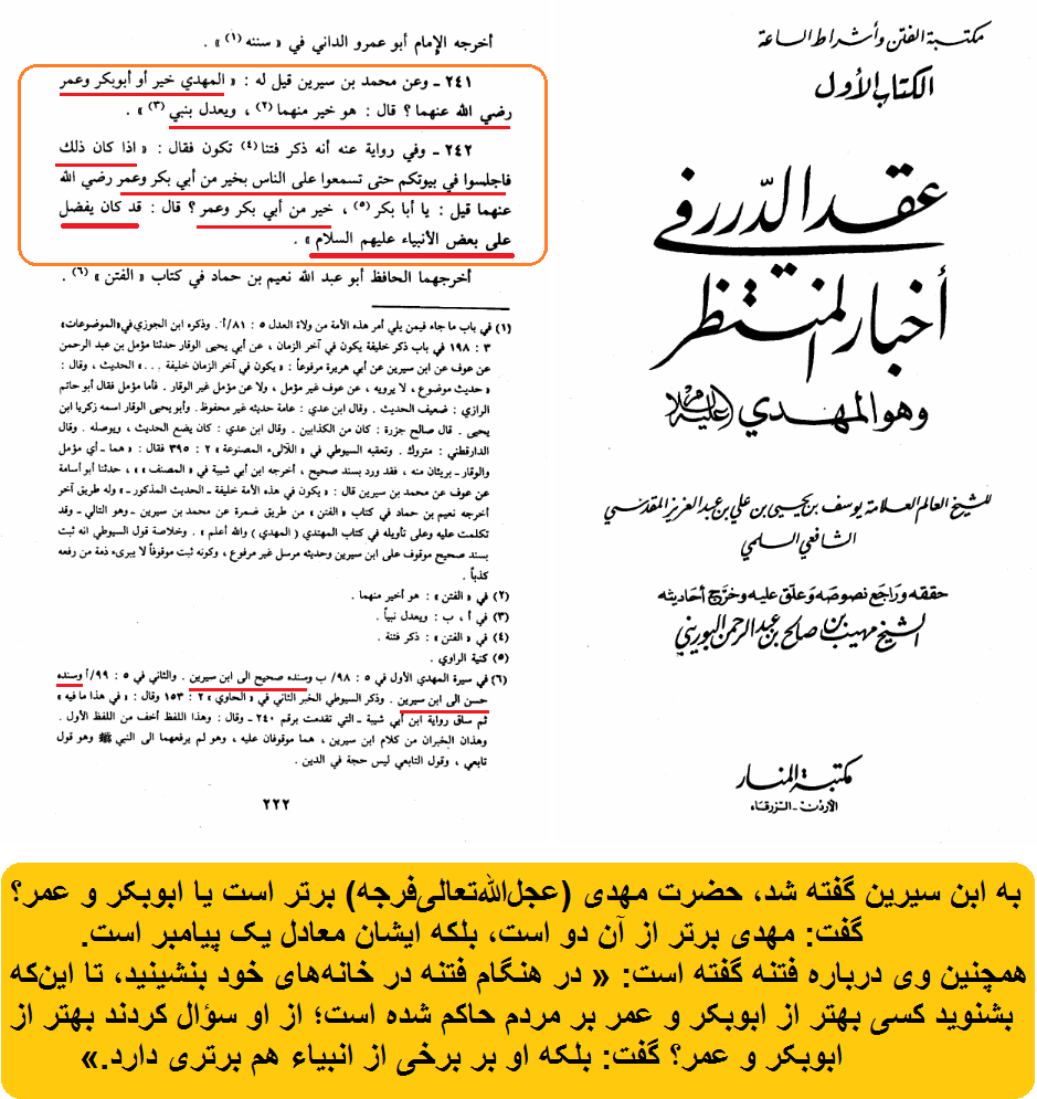 در کتاب عقد الدرر، به نقل از ابنسيرين چنین آمده: «به ابن سیرین گفته شد، حضرت مهدی (عجلاللهتعالیفرجه) برتر است یا ابوبکر و عمر؟ گفت: مهدی برتر از آن دو است، بلكه ایشان معادل یک پیامبر است.» همچنین درباره فتنه گفته است: « در هنگام فتنه در خانههای خود بنشینید، تا اینکه بشنوید کسی بهتر از ابوبکر و عمر بر مردم حاکم شده است؛ از او سؤال کردند بهتر از ابوبکر و عمر؟ گفت: بلکه او بر برخی از انبیاء هم برتری دارد.»