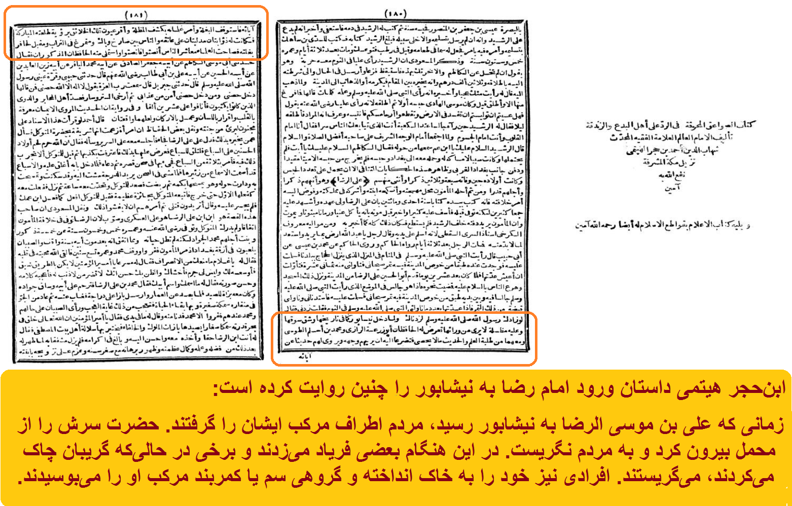 ابنحجر هیتمی داستان ورود امام رضا به نیشبور را چنین روایت کرده است: زمانی که علی بن موسی الرضا به نیشابور رسید، مردم اطراف مرکب ایشان را گرفتند. حضرت سرش را از محمل بیرون کرد و به مردم نگریست. در این هنگام بعضی فریاد میزدند و برخی در حالیکه گریبان چاک میکردند، میگریستند. افرادی نیز خود را به خاک انداخته و گروهی سم یا کمربند مرکب او را میبوسیدند.