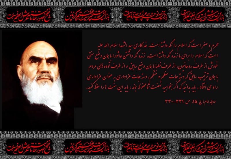 امام خمینی بت شکن تاریخی بود که حکومت ستمشاهی 2500 ساله کشور ایران را نابود کرد و مردم ایران را از زیر یوغ ظلم و ستم و استکبار جهانخوار رهانید و ندای اسلامخواهی را با قیام خود که تأسی از قیام عاشورای حسینی بود به گوش جهانیان رسانید، مردی که با اقتداء به حرکت و نهضت عاشورا، مشعل فروزان شهادت را به دست گرفت و پرچمهای حسینی را برافراشت و ننگ سکوت و ذلت را از دامن طلایهداران تشیع سرخ حسینی که مستضعفان و پابرهنگان عالم بودند را زدود و شعار «هیهات من الذله» را سر داد و حکومت یزیدی زمانه را با سخنان کوبنده خود سرنگون ساخت. گزیدهای از سخنان شیوای آن بزرگمرد تاریخ، دربارهی محرم و صفر و قیام عاشورا و کربلا بدین شرح است:
