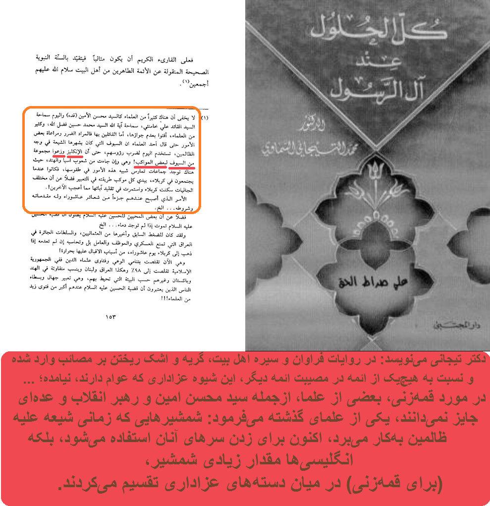 دکتر تیجانی مینویسد: در روایات فراوان و سیره اهل بیت، گریه و اشک ریختن بر مصائب وارد شده و نسبت به هیچیک از ائمه در مصیبت ائمه دیگر، این شیوه عزاداری که عوام دارند، نیامده؛ ... در مورد قمهزنی، بعضی از علما، ازجمله سید محسن امین و رهبر انقلاب و عدهای جایز نمیدانند، ... یکی از علمای گذشته میفرمود: شمشیرهایی که زمانی شیعه علیه ظالمین بهکار میبرد، اکنون برای زدن سرهای آنان استفاده میشود، بلکه انگلیسیها مقدار زیادی شمشیر، (برای قمهزنی) در میان دستههای عزاداری تقسیم میکردند.