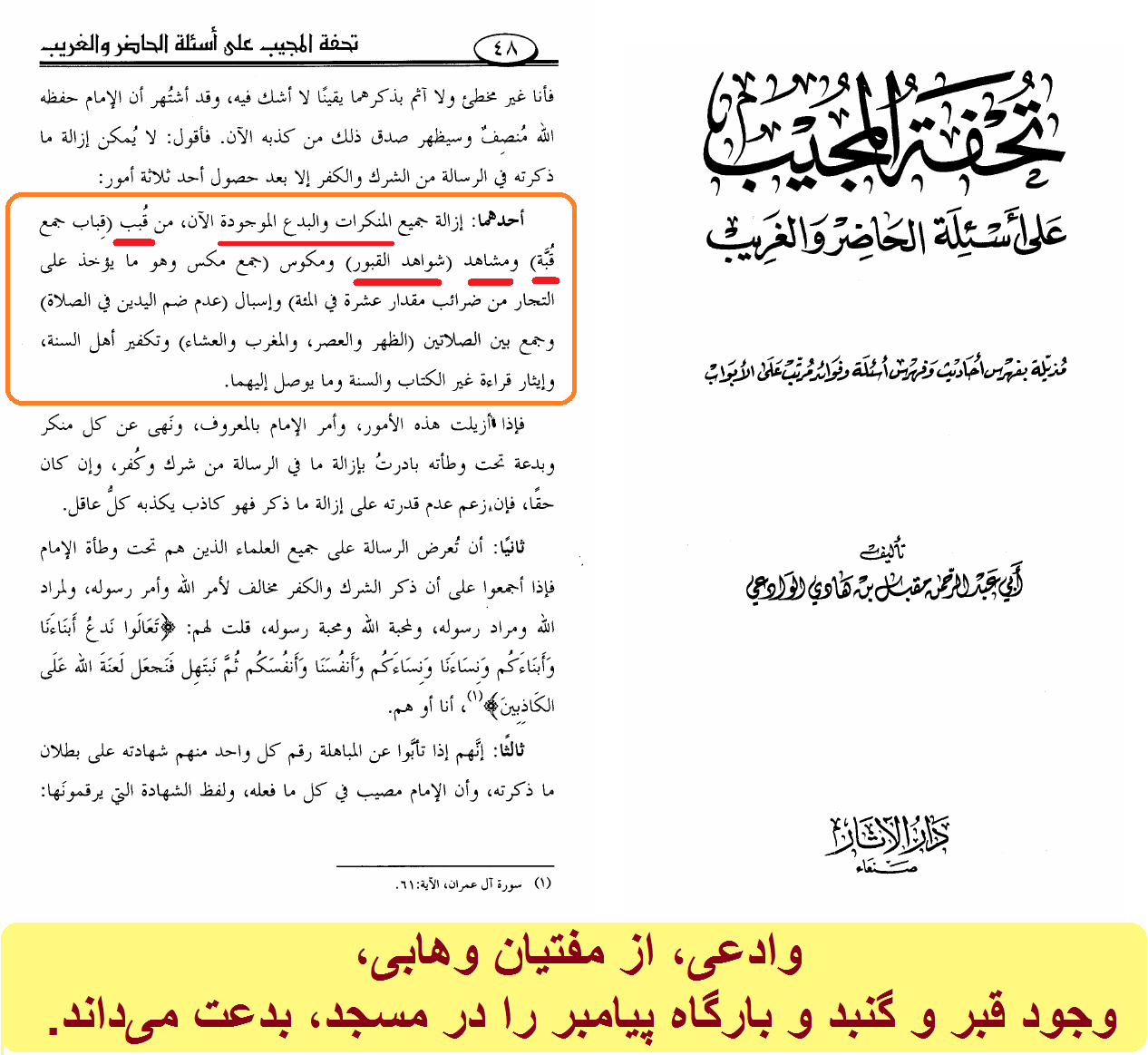 وادعی، از مفتیان وهابی، وجود قبر و گنبد و بارگاه پیامبر را در مسجد، بدعت میداند.