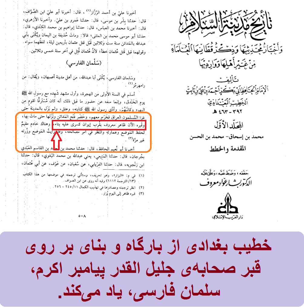 خطیب بغدادی از بارگاه و بنای بر روی قبر صحابه‌ی جلیل القدر پیامبر اکرم، یعنی سلمان فارسی، یاد می‌کند.