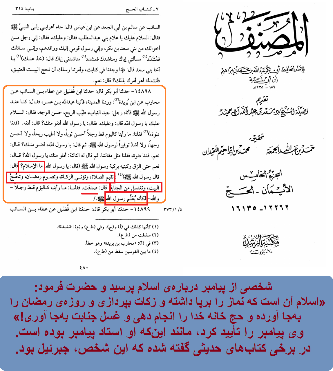 شخصی از پیامبر دربارهی اسلام پرسید و حضرت فرمود: «اسلام آن است که نماز را برپا داشته و زکات بپردازی و روزهی رمضان را بهجا آورده و حج خانه خدا را انجام دهی و غسل جنابت بهجا آوری!» وی پیامبر را تأیید کرد، مانند اینکه او استاد پیامبر بوده است. در برخی کتابهای حدیثی گفته شده که این شخص، جبرئیل بود.