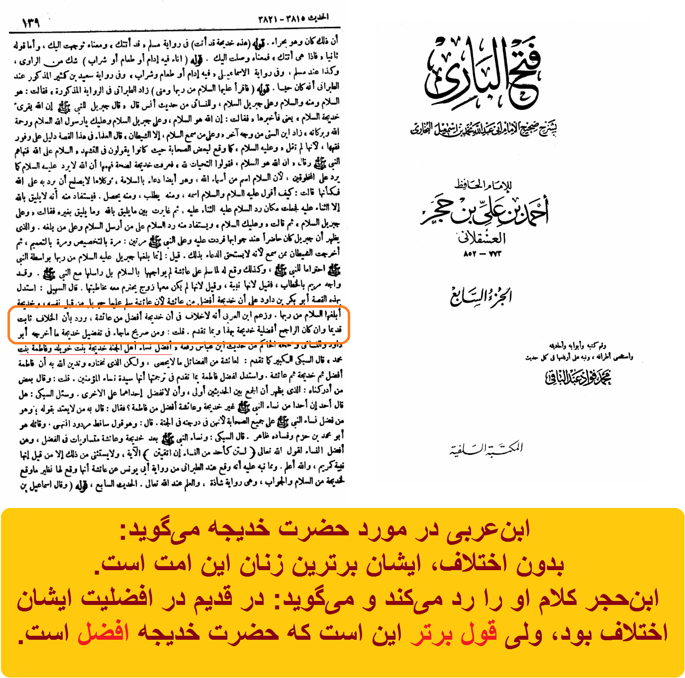 ابن‌حجر کلام او را رد می‌کند و می‌گوید: در قدیم در افضلیت ایشان اختلاف بود، ولی قول برتر این است که حضرت خدیجه افضل است.