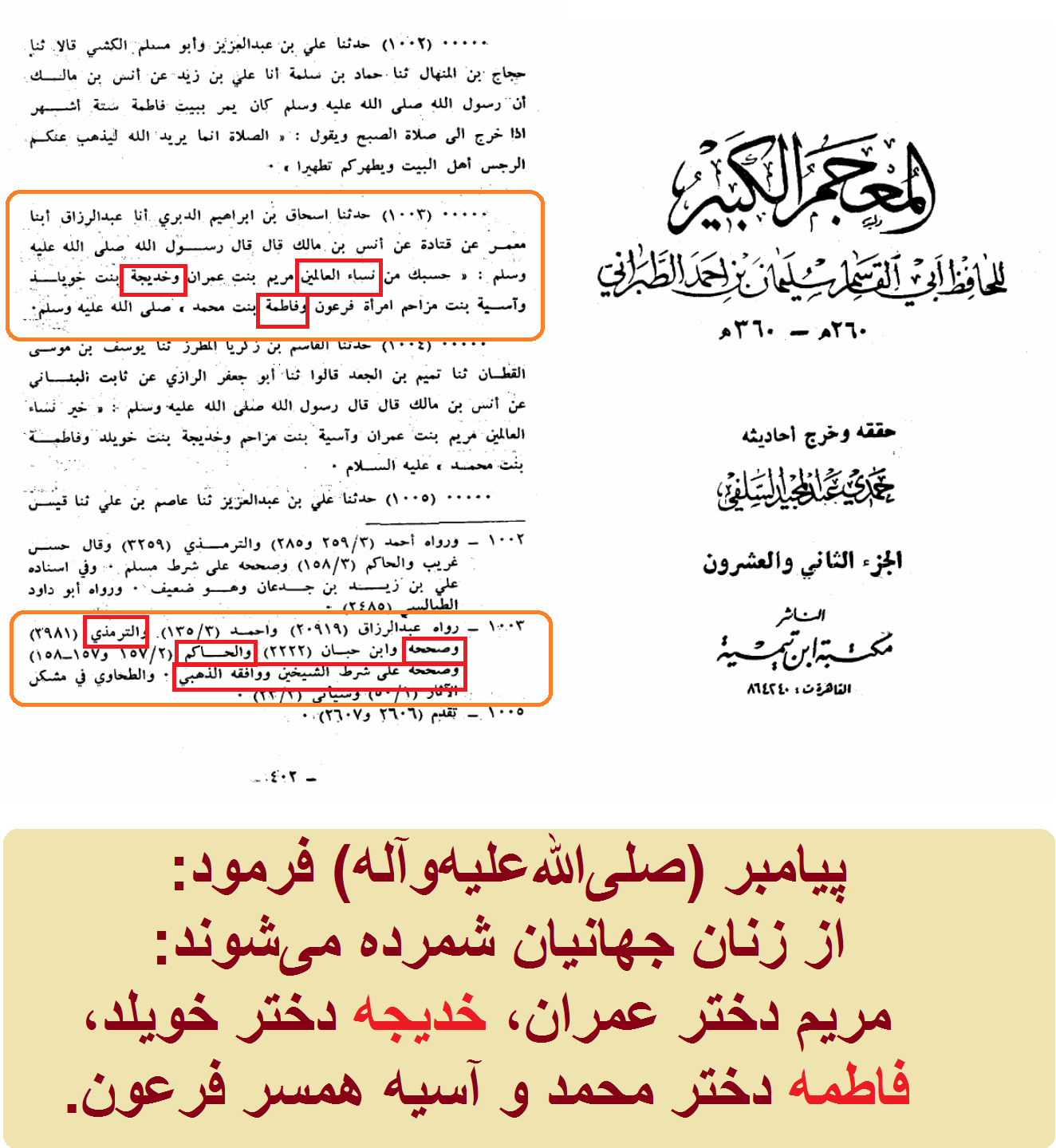 پیامبر (صلی‌الله‌علیه‌وآله) فرمود: از زنان جهانیان شمرده می‌شوند: مريم دختر عمران، خديجة دختر خويلد، فاطمة دختر محمد و آسيه همسر فرعون.
