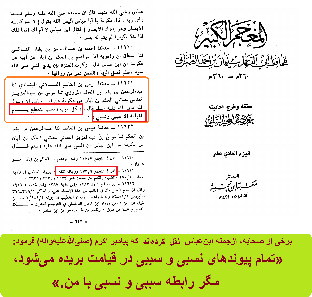 برخی از صحابه، ازجمله ابنعباس نقل شده است که پیامبر اکرم (صلیاللهعلیهوآله) فرمود: «تمام پیوندهای نسبی و سببی در قیامت بریده میشود، مگر رابطه سببی و نسبی با من.»