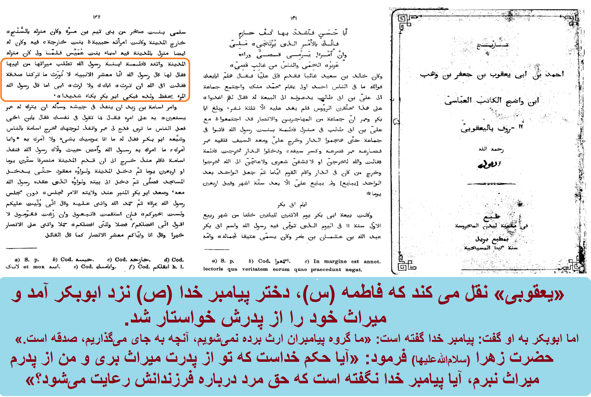 «یعقوبی» نقل می کند که فاطمه (س)، دختر پیامبر خدا (ص) نزد ابوبکر آمد و میراث خود را از پدرش خواستار شد. اما ابوبکر به او گفت: پیامبر خدا گفته است: «ما گروه پیامبران ارث برده نمیشویم، آنچه به جای میگذاریم، صدقه است.» حضرت زهرا (سلاماللهعلیها) فرمود: «آیا حکم خداست که تو از پدرت میراث بری و من از پدرم میراث نبرم، آیا پیامبر خدا نگفته است که حق مرد درباره فرزندانش رعایت میشود؟»