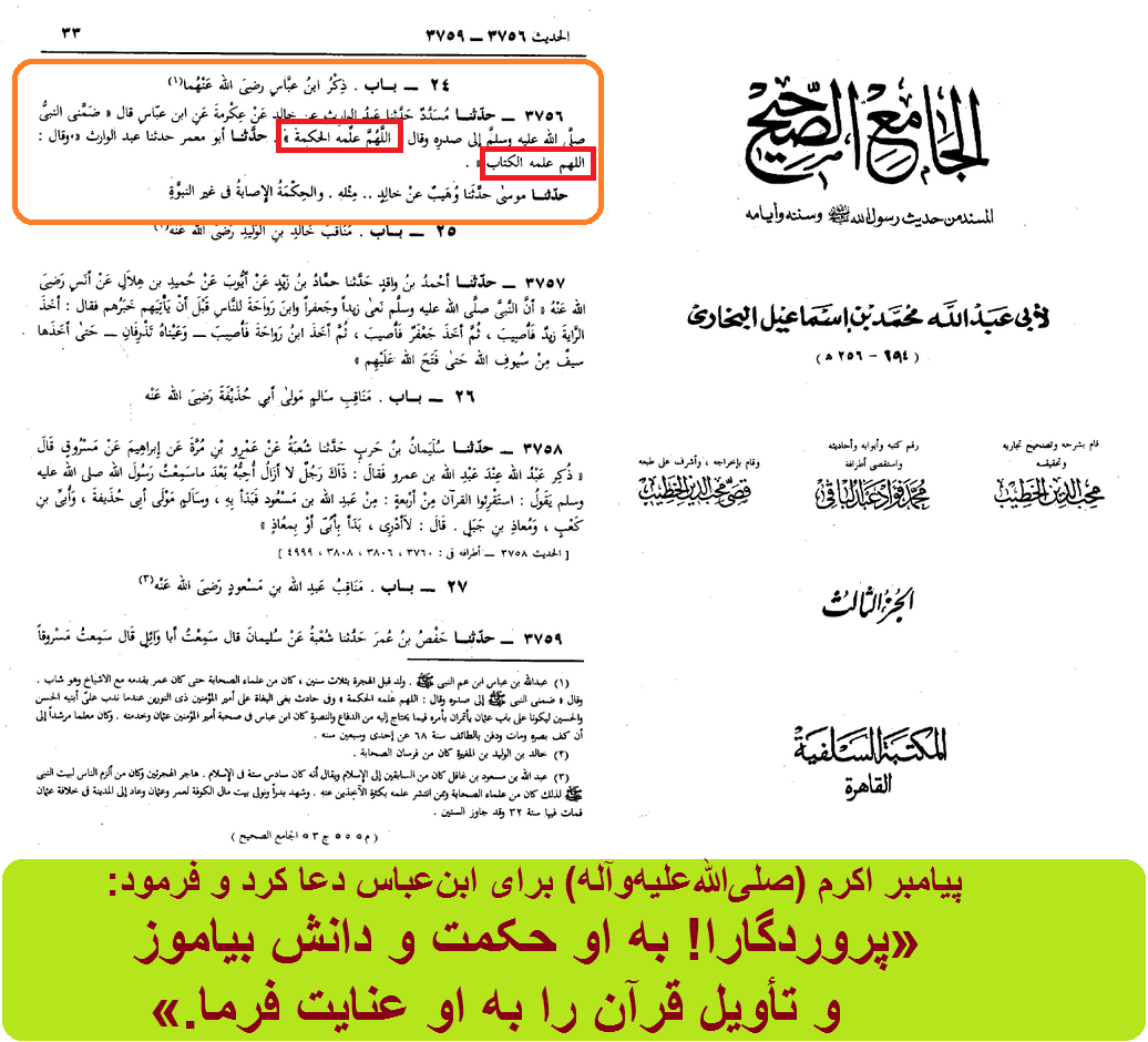 پیامبر اکرم (صلیاللهعلیهوآله) برای ابنعباس دعا کرد و فرمود: «پروردگارا! به او حکمت و دانش بیاموز و تأویل قرآن را به او عنایت فرما.»
