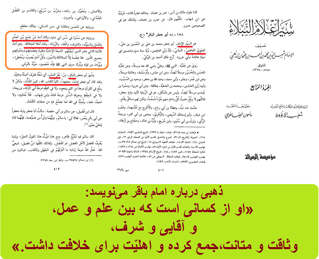 ذهبی درباره امام باقر مینویسد: «او از کسانی است که بین علم و عمل و آقایی و شرف و وثاقت و متانت جمع کرده و اهلیّت برای خلافت داشت.»