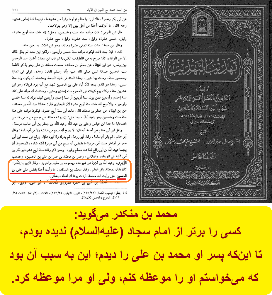 محمد بن منکدر میگوید: من فکر نمیکردم که امام سجاد، فرزندی از خود به یادگار بگذارد که در فضیلت مقارن او باشد، تا اینکه پسر او محمد بن علی را دیدم؛ این به سبب آن بود که میخواستم او را موعظه کنم، ولی او مرا موعظه کرد.