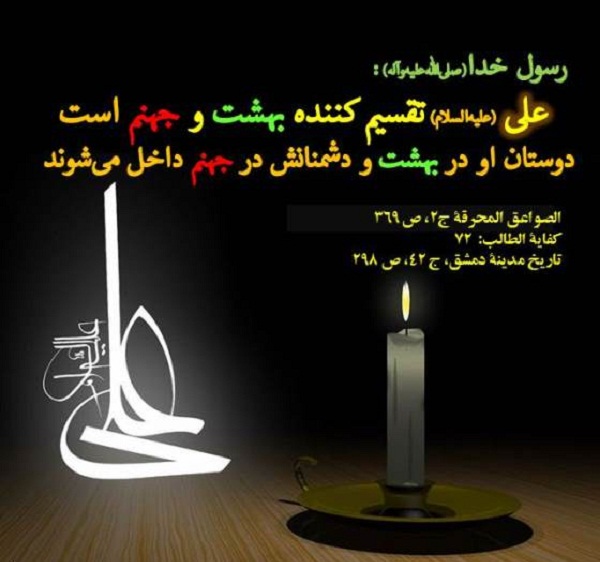 ابن‌اثیر جزری می‌گوید: «علی تقسیم کننده دوزخ و بهشت است، یعنی مردم بر دو گروه هستند، گروهی که با علی هستند و اهل بهشت و گروهی که علیه ایشان هستند، در دوزخ.»