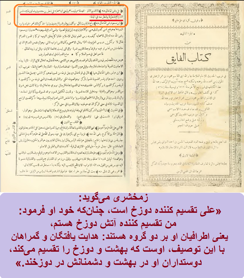 زمخشری میگوید: «علی تقسیم کننده دوزخ است، چنانکه خود او فرمود: من تقسیم کننده آتش دوزخ هستم، یعنی اطرافیان او بر دو گروه هستند: هدایت یافتگان و گمراهان. با این توصیف، اوست که بهشت و دوزخ را تقسیم میکند، دوستداران او در بهشت و دشمنانش در دوزخند.»