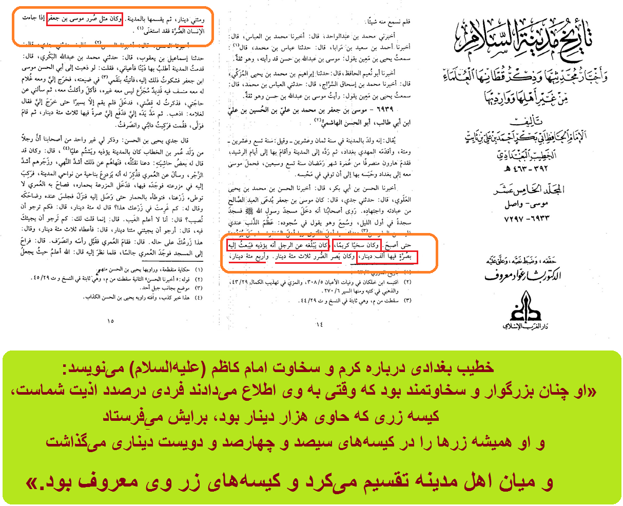 خطیب بغدادی درباره کرم و سخاوت امام کاظم (علیهالسلام) مینویسد: «او چنان بزرگوار و سخاوتمند بود که وقتی به وی اطلاع میدادند فردی درصدد اذیت شماست، کیسه زری که حاوی هزار دینار بود، برایش میفرستاد و او همیشه زرها را در کیسههای سیصد و چهارصد و دویست دیناری میگذاشت و میان اهل مدینه تقسیم میکرد و کیسههای زر وی معروف بود.»