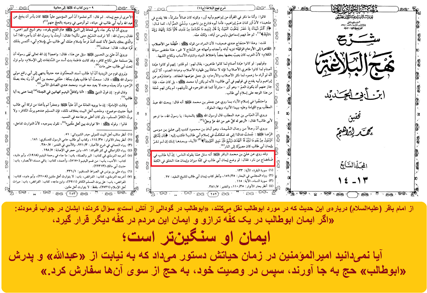 از امام باقر (علیهالسلام) دربارهی این حدیث که در مورد ابوطالب نقل میکنند، «ابوطالب در گودالی از آتش است» سؤال کردند؛ ایشان در جواب فرمودند: «اگر ایمان ابوطالب در یک کفّه ترازو و ایمان این مردم در کفّه دیگر قرار گیرد، ایمان او سنگینتر است؛ آیا نمیدانید امیرالمؤمنین در زمان حیاتش دستور میداد که به نیابت از «عبدالله» و پدرش «ابوطالب» حج به جا آورند، سپس در وصیت خود، به حج از سوی آنها سفارش کرد.»