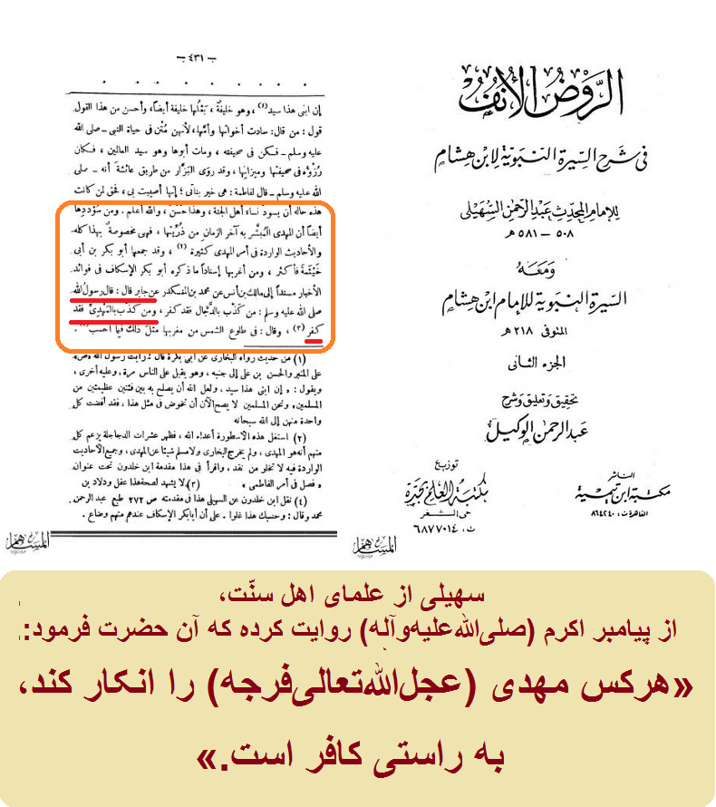 سهیلی از علماى اهل سنّت، از پیامبر اکرم (صلیاللهعلیهوآله) روایت کرده که آن حضرت فرمود: «هرکس مهدى (عجلاللهتعالیفرجه) را انکار کند، به راستى کافر است.»