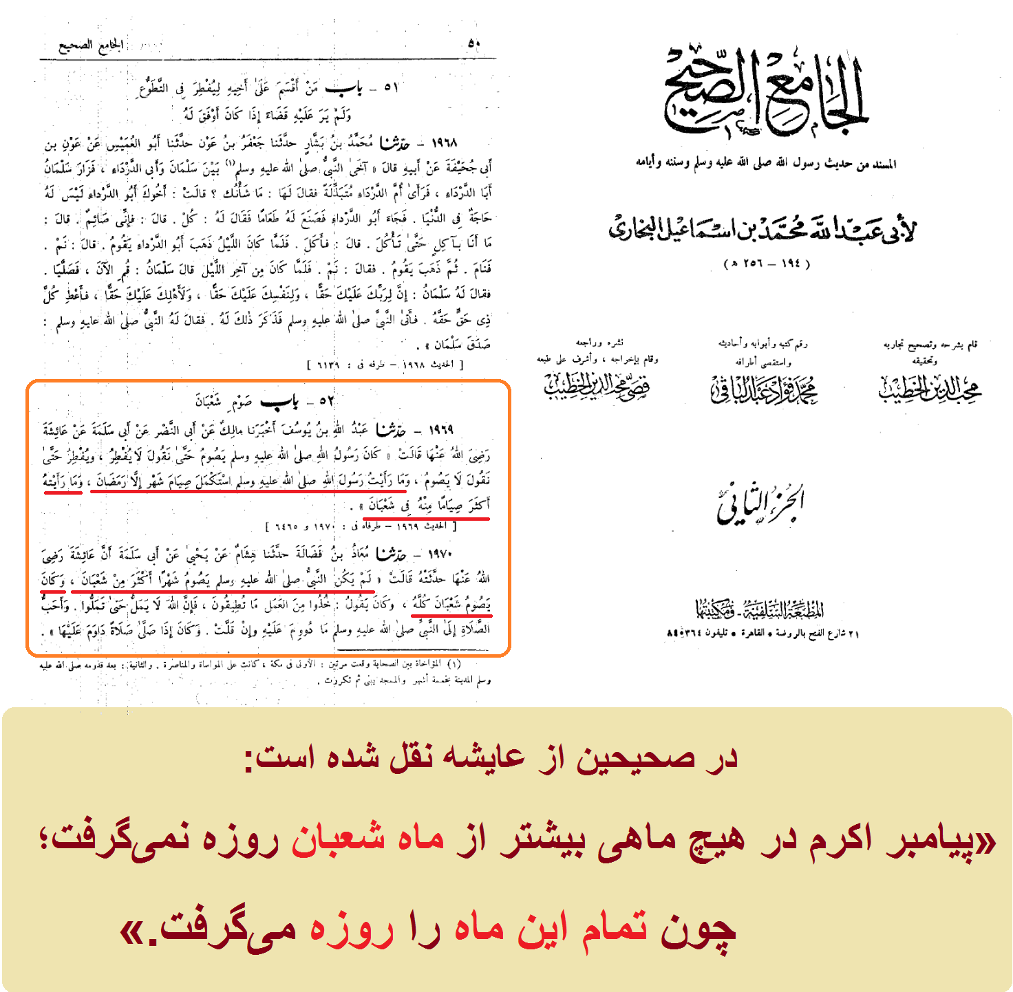در صحیحین از عایشه نقل شده است: «در هیچ ماهی بیشتر از ماه شعبان روزه نمیگرفت؛ چون تمام این ماه را روزه میگرفت.»