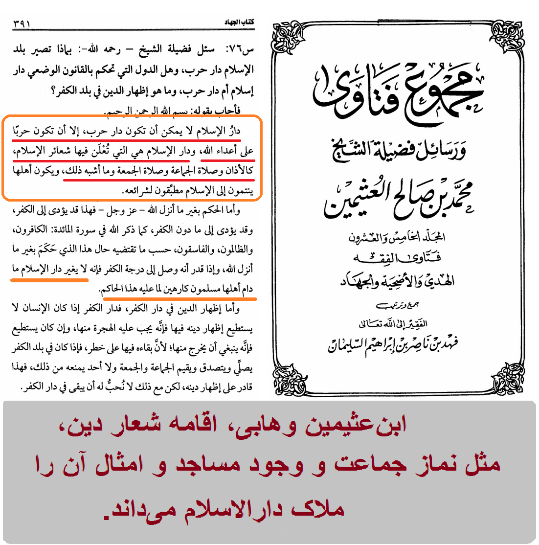ابنعثیمین وهابی، اقامه شعار دین، مثل نماز جماعت و وجود مساجد و امثال آن را ملاک دارالاسلام میداند.