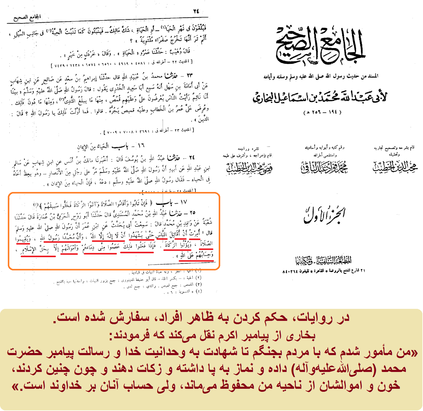 در روایات، حکم کردن به ظاهر افراد، سفارش شده است. بخاری از پیامبر اکرم نقل میکند که فرمودند: «من مأمور شدم که با مردم بجنگم تا شهادت به وحدانیت خدا و رسالت پیامبر حضرت محمد (صلیاللهعلیهوآله) داده و نماز به پا داشته و زکات دهند و چون چنین کردند، خون و اموالشان از ناحیه من محفوظ میماند، ولی حساب آنان بر خداوند است.»