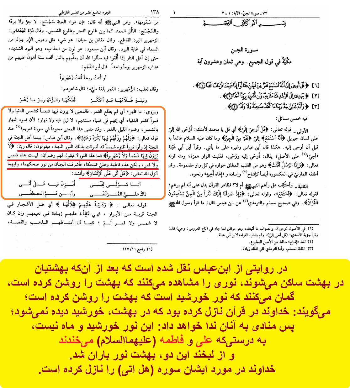 در روایتی از ابنعباس نقل شده است که بعد از آنکه بهشتیان در بهشت ساکن میشوند، نوری را مشاهده میکنند که بهشت را روشن کرده است، گمان میکنند که نور خورشید است که بهشت را روشن کرده است؛ آنها میگویند: خداوند در قرآن نازل کرده بود که در بهشت، خورشید دیده نمیشود؛ پس منادی به آنان ندا خواهد داد: این نور خورشید و ماه نیست، به درستیکه علی و فاطمه (علیهماالسلام) میخندند و از لبخند این دو، بهشت نور باران شد. خداوند در مورد ایشان سوره (هل اتی) را نازل کرده است.