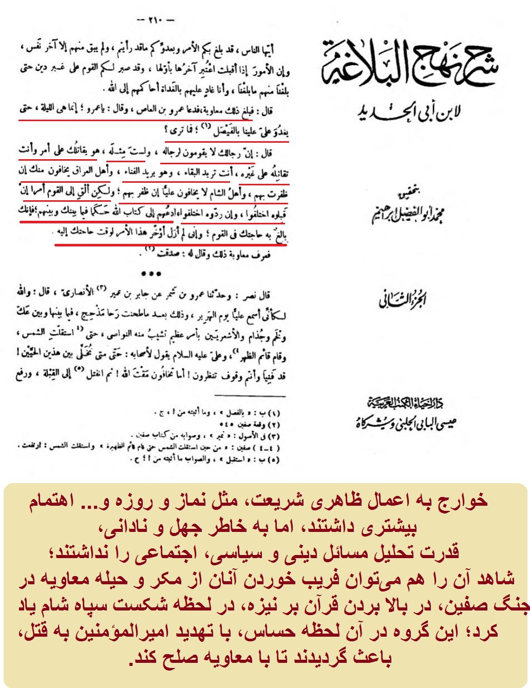 خوارج به اعمال ظاهری شریعت، مثل نماز و روزه و... اهتمام بیشتری داشتند، اما به خاطر جهل و نادانی، قدرت تحلیل مسائل دینی و سیاسی، اجتماعی را نداشتند؛ شاهد آن را هم میتوان فریب خوردن آنان از مکر و حیله معاویه در جنگ صفین، در بالا بردن قرآن بر نیزه، در لحظه شکست سپاه شام یاد کرد؛ این گروه در آن لحظه حساس، با تهدید امیرالمؤمنین به قتل، باعث گردیدند تا با معاویه صلح کند.