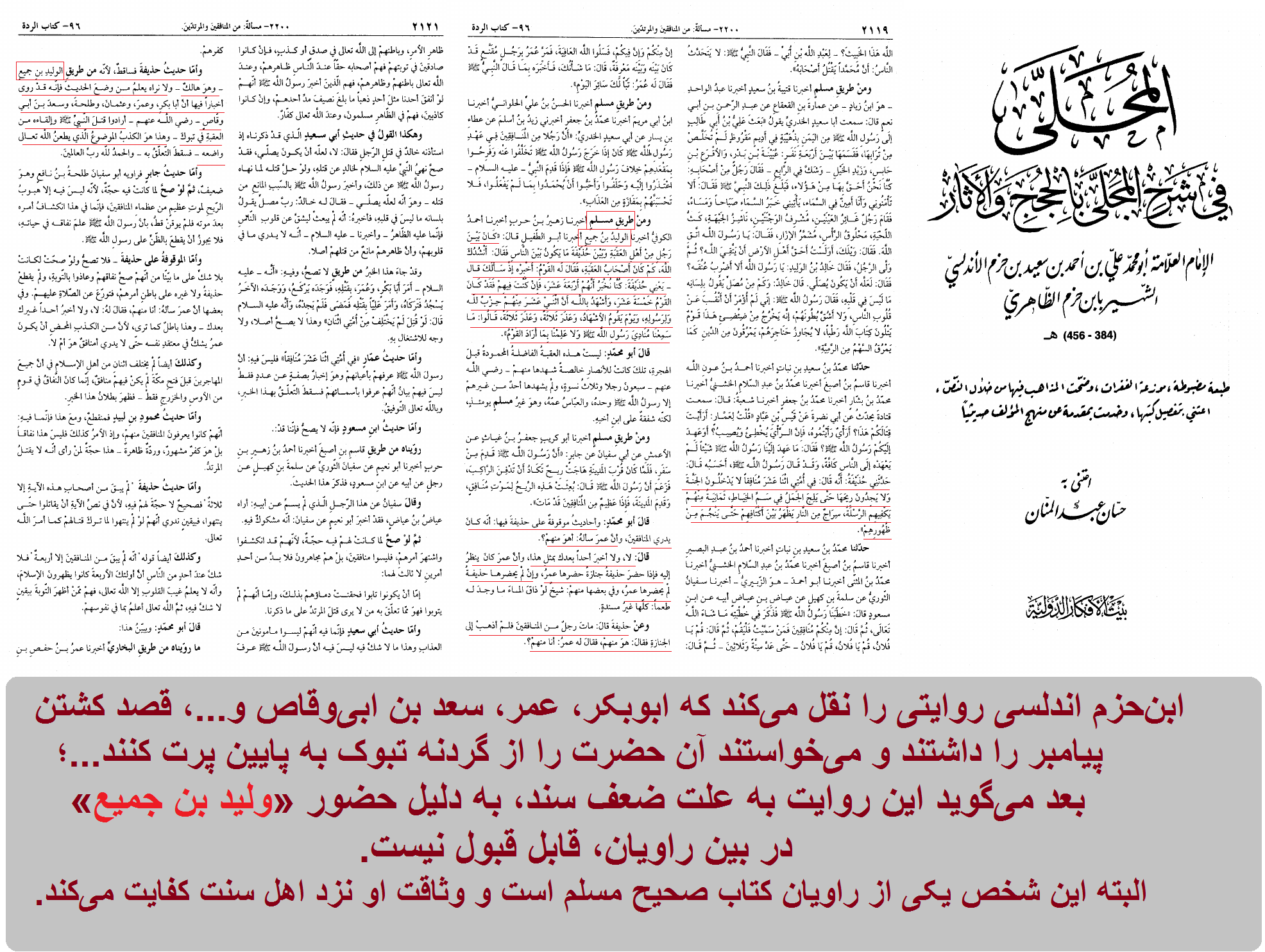ابنحزم اندلسی روایتی را نقل میکند که ابوبکر، عمر، سعد بن ابیوقاص و...، قصد کشتن پیامبر را داشتند و میخواستند آن حضرت را از گردنه تبوک به پایین پرت کنند...؛ بعد میگوید این روایت به علت ضعف سند، به دلیل حضور «ولید بن جمیع» در بین راویان، قابل قبول نیست.