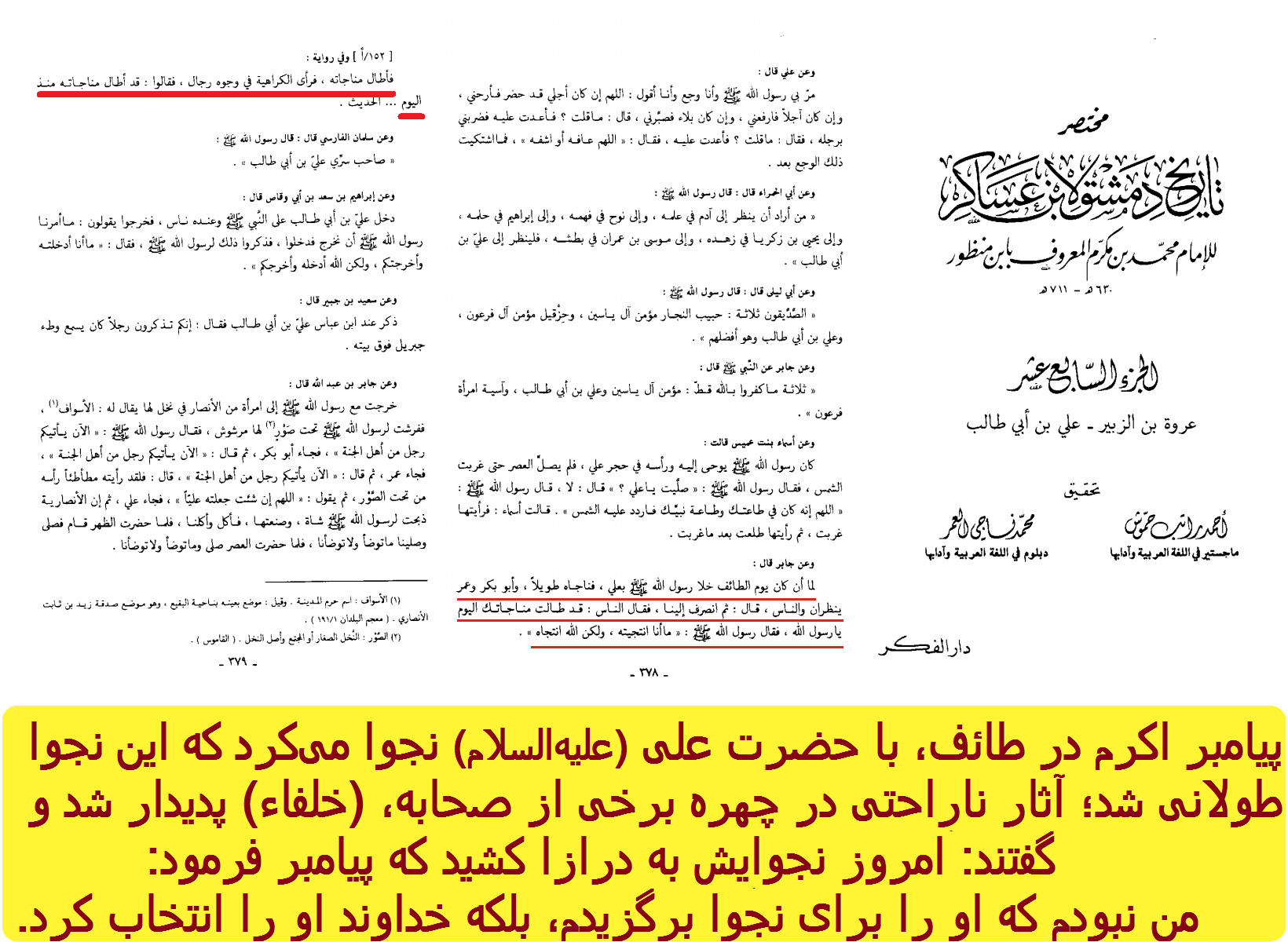 پیامبر اکرم در طائف، با حضرت علی (علیهالسلام) نجوا میکرد که این نجوا طولانی شد؛ آثار ناراحتی در چهره برخی از صحابه، (خلفاء) پدیدار شد و گفتند: امروز نجوایش به درازا کشید که پیامبر فرمود: من نبودم که او را برای نجوا برگزیدم، بلکه خداوند او را انتخاب کرد.