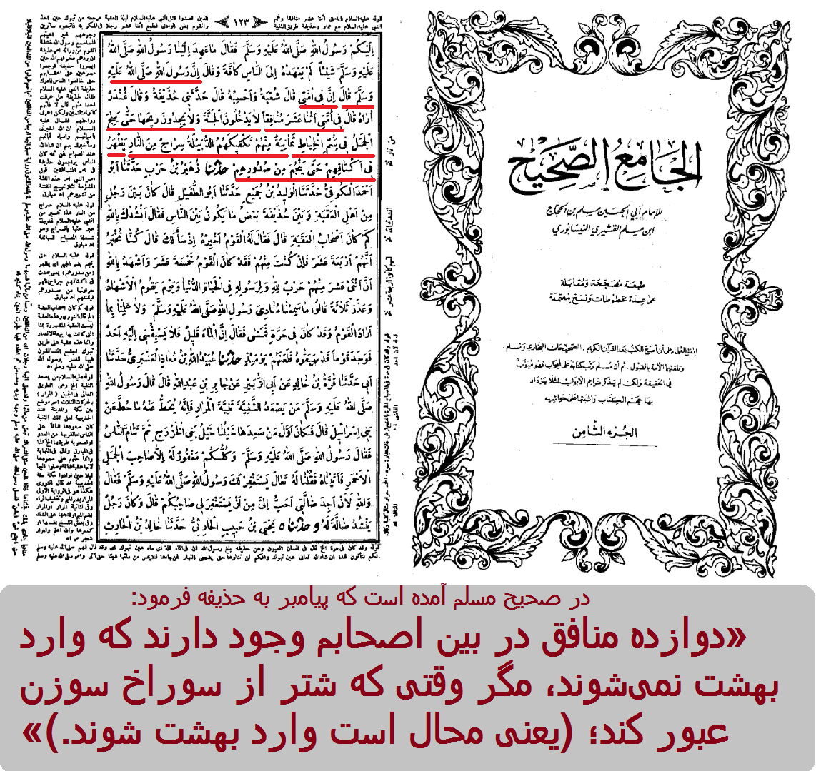 در صحیح مسلم آمده است که پیامبر به حذیفه فرمود: «دوازده منافق در بین اصحابم وجود دارند که وارد بهشت نمیشوند، مگر وقتی که شتر از سوراخ سوزن عبور کند؛ (یعنی محال است وارد بهشت شوند.)»