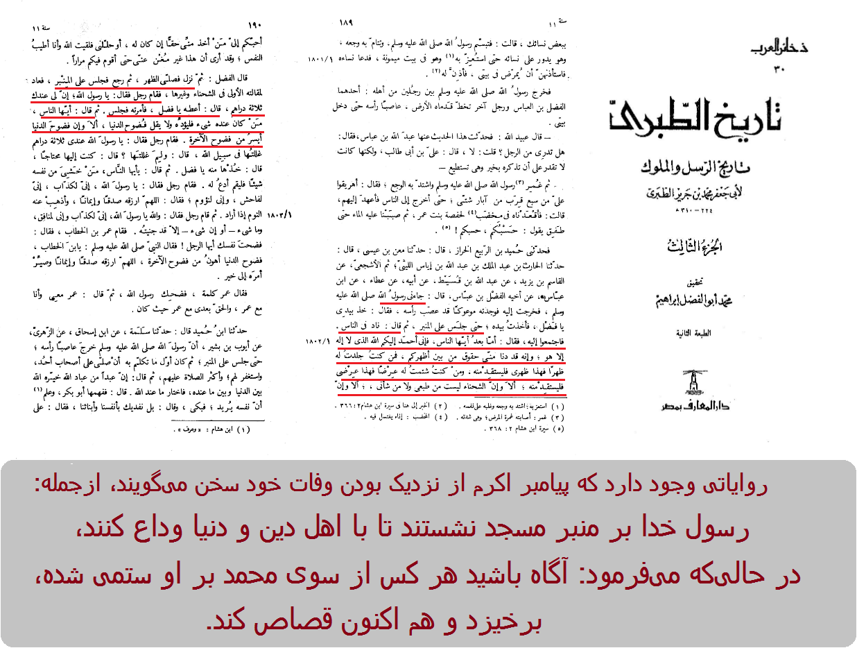 رسول خدا بر منبر مسجد نشستند تا با اهل دین و دنیا وداع کنند، در حالی‌که می‌فرمود: آگاه باشید هر کس از سوی محمد بر او ستمی شده است، برخیزد و هم اکنون قصاص کند.