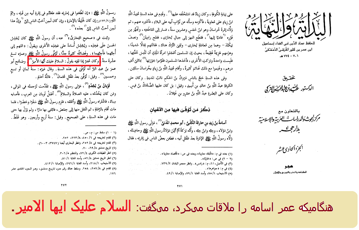 هنگامیکه عمر اسامه را ملاقات میکرد، میگفت: السلام علیک ایها الامیر.البدایه و النهایه، ابن کثیر، ج11، ص271و272.مقاله: «اقدامات یاران سقیفه بنی ساعده قبل و بعد رحلت پیامبر»