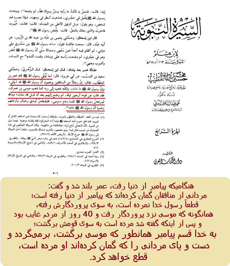 هنگامیکه پیامبر از دنیا رفت، عمر بلند شد و گفت: مردانی از منافقان گمان کرده‌اند که پیامبر از دنیا رفته است؛ قطعاً رسول خدا نمرده است، به سوی پروردگارش رفته، همانگونه که موسی نزد پروردگار رفت و 40 روز از مردم غایب بود و پس از اینکه گفته شد مرده است به سوی قومش برگشت؛ به خدا قسم پیامبر همانطور که موسی برگشت، برمی‌گردد و دست و پای مردانی را که گمان کرده‌اند او مرده است، قطع خواهد کرد.