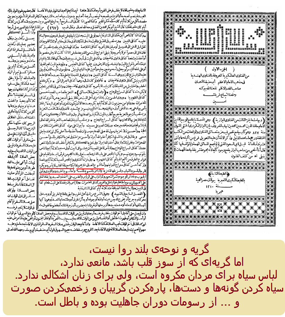 گریه و نوحهی بلند روا نیست، اما گریهای که از سوز قلب باشد، مانعی ندارد، لباس سیاه برای مردان مکروه است، ولی برای زنان اشکالی ندارد. سیاه کردن گونهها و دستها، پارهکردن گریبان و زخمیکردن صورت و ... از رسومات دوران جاهلیت بوده و باطل است.