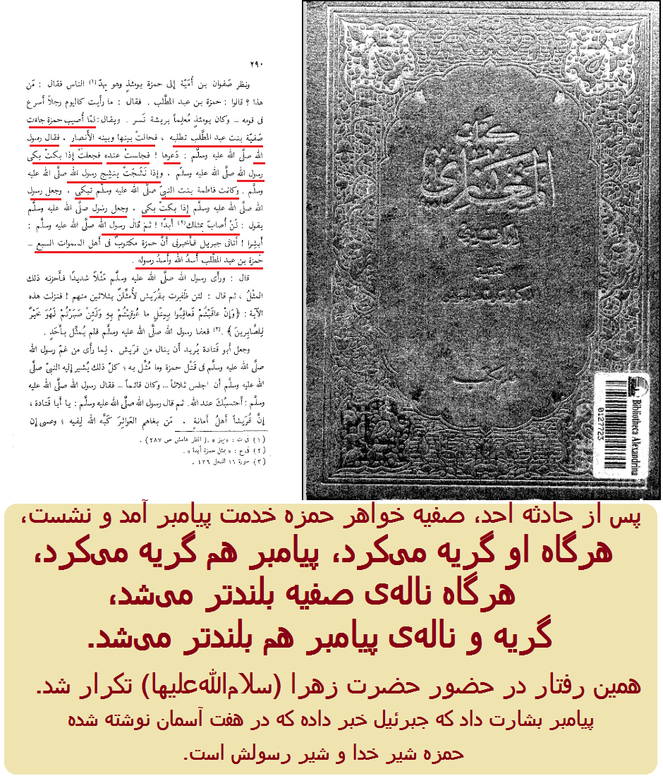 پس از حادثه احد، صفیه خواهر حمزه خدمت پیامبر آمد و نشست، ... هرگاه گریه می‌کرد، پیامبر هم گریه می‌کرد، هرگاه ناله‌ی صفیه بلندتر می‌شد، گریه و ناله‌ی پیامبر هم بلندتر می‌شد...