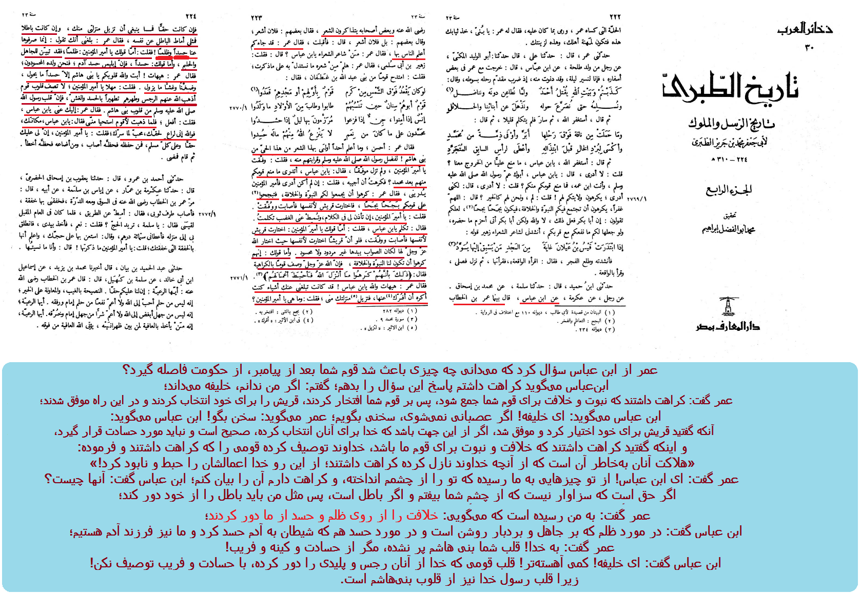 ابنعباس در پاسخ کلام عمر بن خطاب که گفت: نبوت و جانشینی یکجا جمع نمیشود، گفت: ... بر اساس حسادت و ظلم و ستم شماها بود که خلافت رسول خدا (صلیاللهعلیهوآله) را از ما گرفتید.