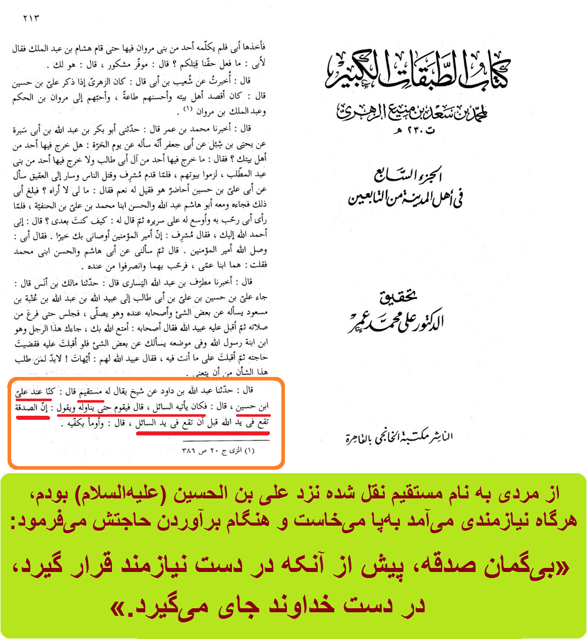 از مردی به‌ نام مستقیم نقل شده نزد علی بن الحسین (علیه‌السلام) بودم، هرگاه نیازمندی می‌آمد به‌پا می‌خاست و هنگام برآوردن حاجتش می‌فرمود: «بی‌گمان صدقه، پیش از آنکه در دست نیازمند قرار گیرد، در دست خداوند جای می‌گیرد.»