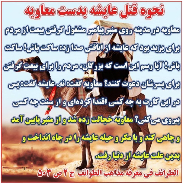 معاویه روی منبر می‌خواست برای پسرش یزید بیعت بگیرد، ولی عایشه گفت: آیا سه خلیفه پیش از تو برای پسرانشان بیعت گرفتند؟ معاویه گفت نه، عایشه گفت: پس تو به کدامیک از آن‌ها اقتداء می‌کنی؟ معاویه شرمسار شد، لذا چاهی بر سر راه عایشه حفر کرد و عایشه در آن افتاد و کشته شد.