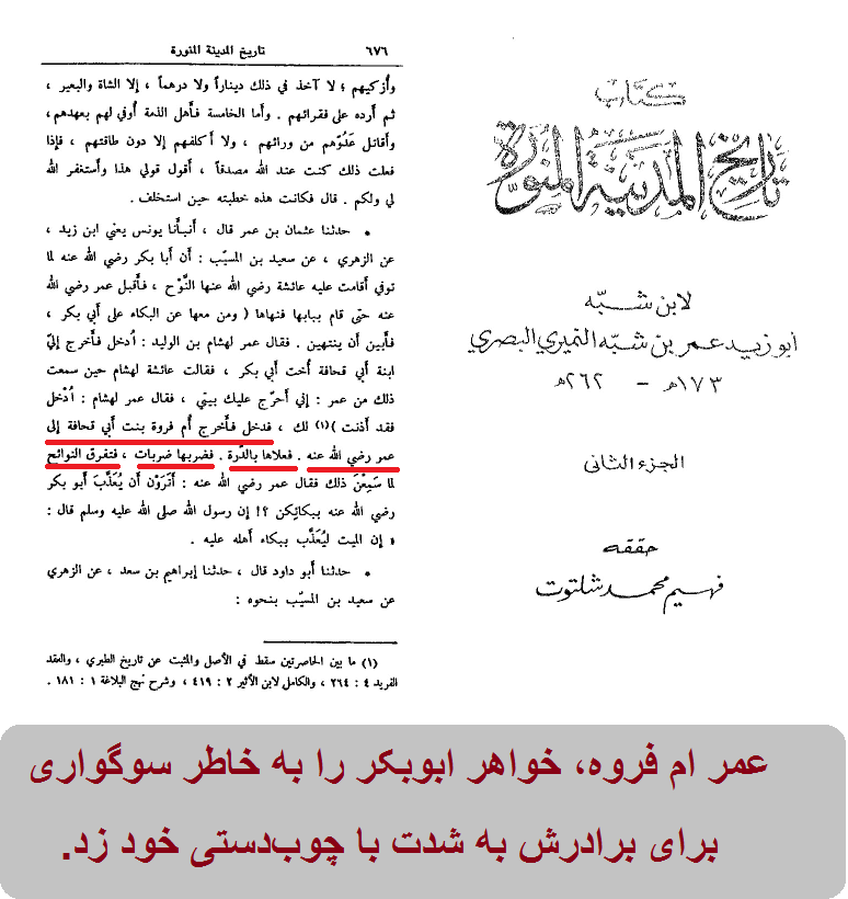 عمر ام فروه، خواهر ابوبکر را به خاطر سوگواری برای برادرش به شدت با چوبدستی خود زد.