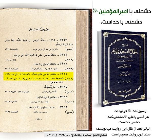 و حدیث صحیح نبوی نسبت به حضرت علی (علیه‌السلام) داریم، که در کتب اهل سنت با عبارات مختلف و نزدیک به هم، درباره‌ی شناخت نفاق و منافق وارد شده که پیامبر فرمود: «لایحب علیاً منافق و لایبغض علیاً مومن.[7] منافق علی را دوست نمی‌دارد و مومن علی را دشمن نمی‌دارد.»