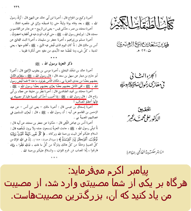 پیامبر اکرم میفرماید: هرگاه بر یکی از شما مصیبتی وارد شد، از مصیبت من یاد کنید که آن، بزرگترین مصیبتهاست.